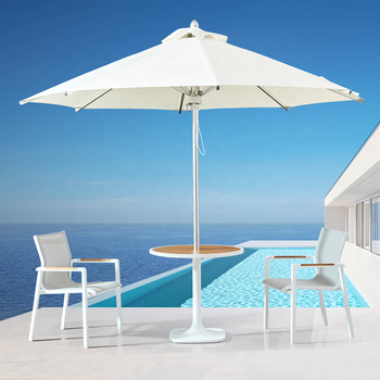 مجموعة طاولة بيضاء للعشاء في المقاهي في الحديقة طاولة من الألومنيوم مع مقعدين ومظلة بها فتحة أثاث خارجية من خشب الساج