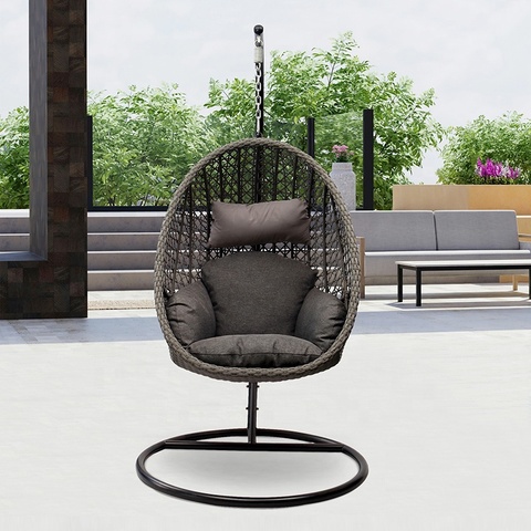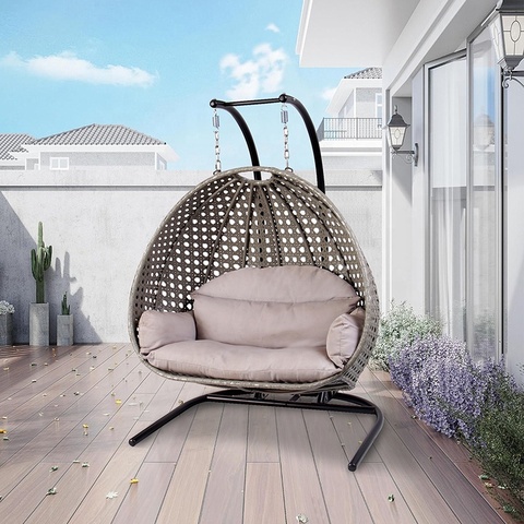 モダングレー2ピースウィッカー金属吊り家具屋外ガーデンラタンダブルスイング卵椅子スタンド付き
